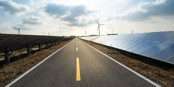 Road with solar and wind in the background